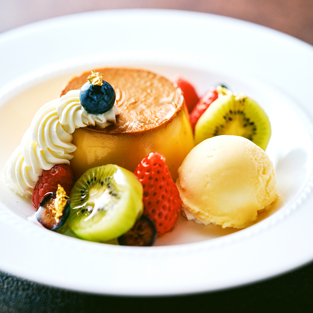 ホテルオークラ京都伝統のカスタードプディングに、バニラアイスクリームと季節のフルーツを添えて。