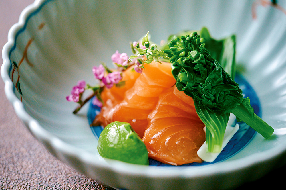 ■ 醤油麹漬けサーモンの炙り  春野菜 菜の花ソース